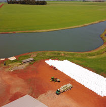 Organização do feno seco em fardos para depois armazenar. Empacotamento: no caso de pré-secado, com maior teor de umidade, deve-se empacotar o fardo com filme plástico, para a realizar a fermentação e conservação da forragem.